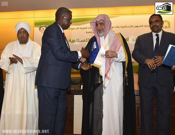 وسلم معالي وزير الدولة بوزارة التعليم العالي البروفيسور التيجاني مصطفى شهادة الدكتوراه الفخرية لمعالي الشيخ صالح آل الشيخ، خلال الحفل الكبير المعد بهذه المناسبة، الذي شهده معالي رئيس مجمع الفقه الإسلامي السوداني الدكتور عصام البشير، ووزير الإرشاد والأوقاف السوداني الدكتور عمار ميرغني حسين، وفضيلة الرئيس العام لجماعة أنصار السنة المحمدية في السودان الدكتور إسماعيل عثمان الماحي، وسفير خادم الحرمين الشريفين لدى السودان علي بن حسن جعفر، ومديري الجامعات الإفريقية والسودانية، وعدد كبير من العلماء والدعاة.