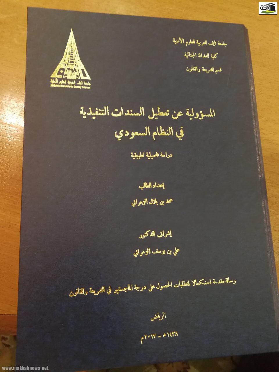 منحت جامعة نايف للعلوم الأمنية الباحث محمد بلال موسى الاحمدي الزهراني درجة الماجستير في الشريعة والقانون عن رسالته بعنوان ” المسؤلية عن تعطيل السندات التنفيذية في النظام السعودي- دراسة تأصيلية تطبيقية.