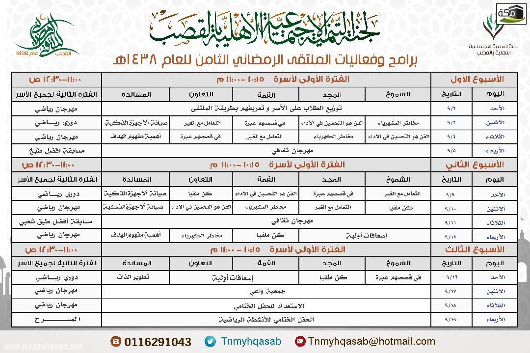 انطلقت يوم أمس الأحد ١٤٣٨/٩/٢ بداية فعاليات وأنشطة الملتقى الرمضاني الثامن للعام ١٤٣٨هـ والذي تنظمه لجنة التنمية الاجتماعية الأهلية بالقصب بمحافظة شقراء وستستمر حتى يوم الثلاثاء الموافق ١٤٣٨/٩/١٩، وذلك بعد أن أعلنت عن بدء التسجيل منذ أسبوع تقريبا ؛ حيث يستهدف الملتقى طلاب المرحلة الابتدائية والمتوسطة والثانوية ، وقد تجاوز عدد الطلاب المسجلين في الملتقى أكثر من (١٣٠) مائة وثلاثين طالبا .