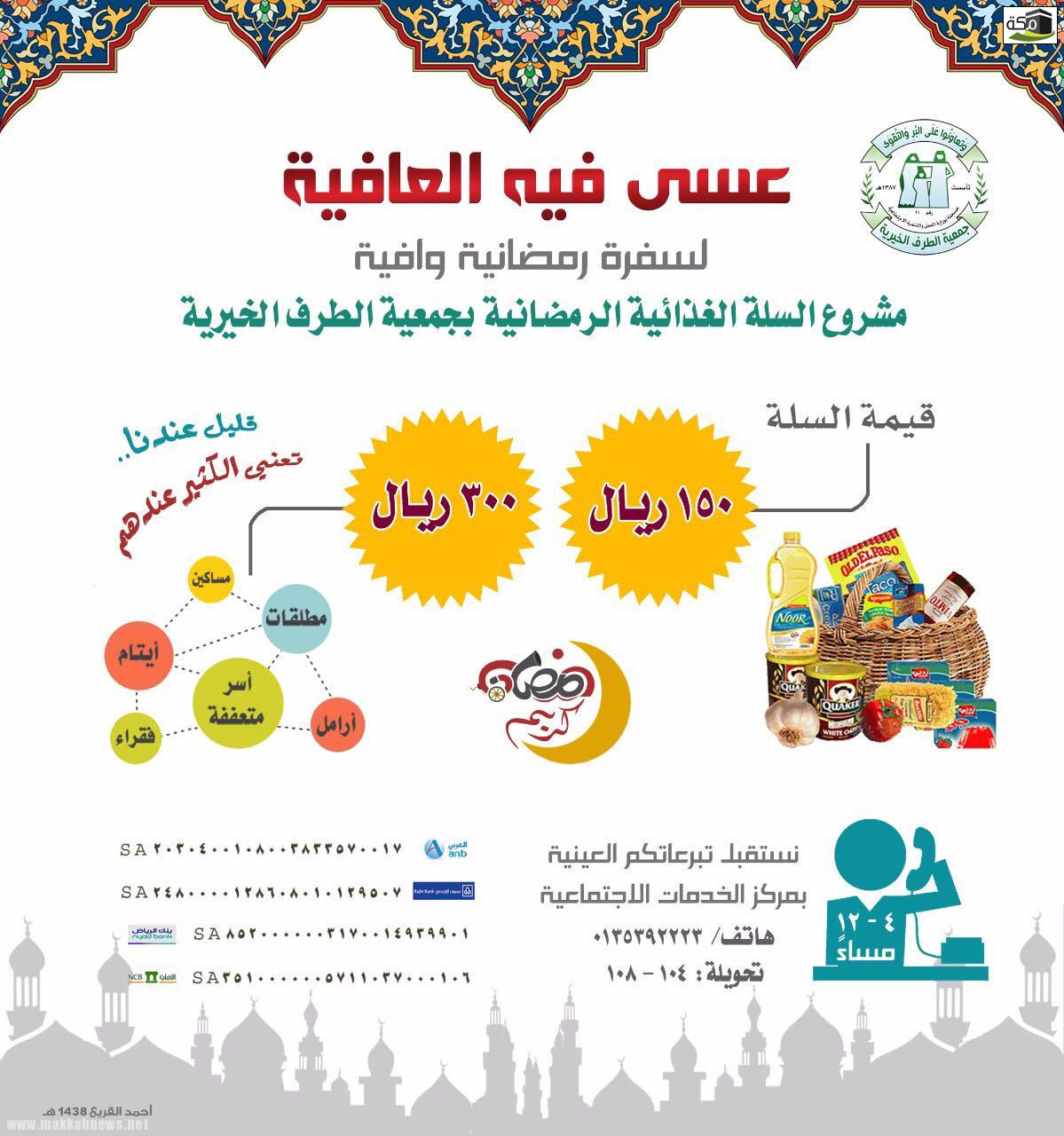 باشرت جمعية الطرف الخيرية بتوزيع السلة الرمضانية العينية والتي شملت أكثر من ( ٤٤٥ أسرة مستفيده ) من الأسر الفقيرة ، والأرامل والأيتام والمطلقات بمبلغ وقدره 123,218، (مئة وثلاثة وعشرون الف ومئتان وثمانية عشر ريال ) ،،