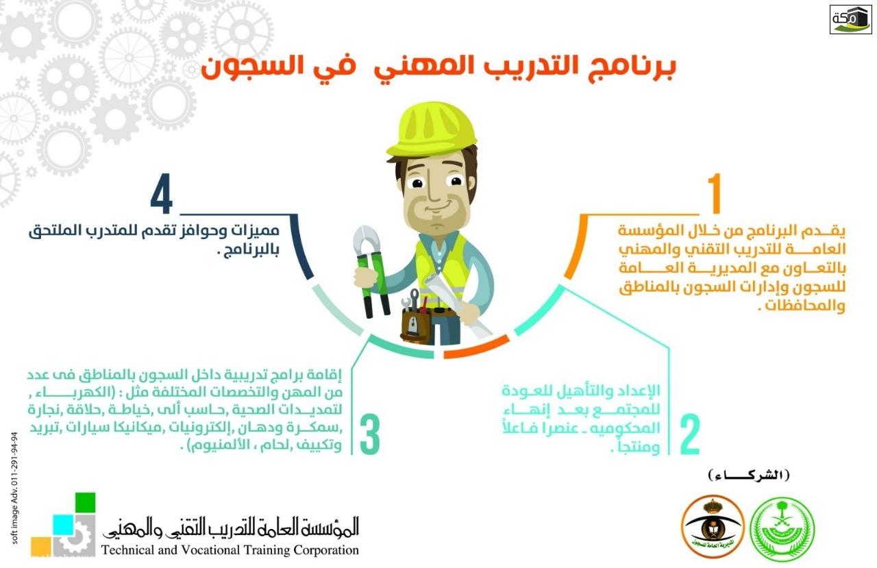 كشف مدير عام التدريب التقني والمهني بمنطقة مكة المكرمة فيصل بن عقيل كدسه عن إحصائية المعاهد الصناعية الثانوية للتدريب في سجون مكة المكرمة وجدة والطائف ، حيث أشار إلى أن الطاقة الاستيعابية لهذه المعاهد تصل إلى (1118) متدرب نزيل خلال العام التدريبي ، بواقع 255 متدرب في كل فصل تدريبي بإصلاحية جدة ، و 154 متدرب في كل فصل تدريبي بإصلاحية مكة المكرمة ، و 300 متدرب في كل فصل تدريبي بإصلاحية الطائف ، موضحاً أن (654) متدرب نزيل تم تدريبهم خلال العام 1437 / 1438هـ.
