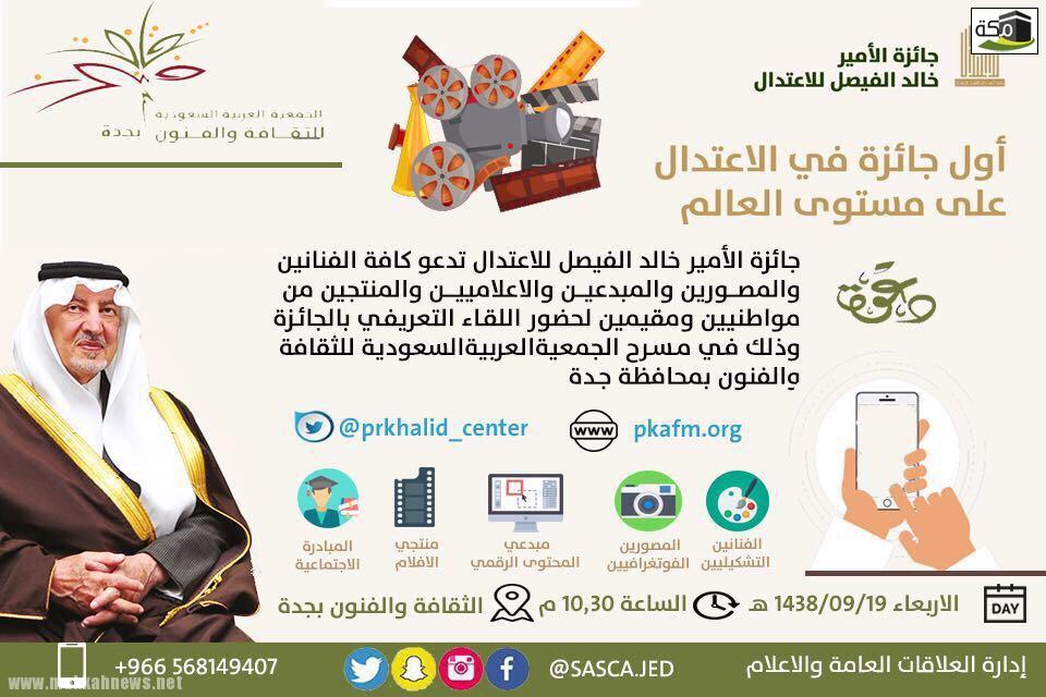 تدعو جائزة الأمير خالد الفيصل للاعتدال كافة المبدعين ومنتجي الأفلام والفنانين والمصورين ومبدعي المحتوى الرقمي لحضور اللقاء التعريفي بالجائزة بمقر الجمعية العربية السعودية للثقافة والفنون بمحافظة جدة الأربعاء القادم