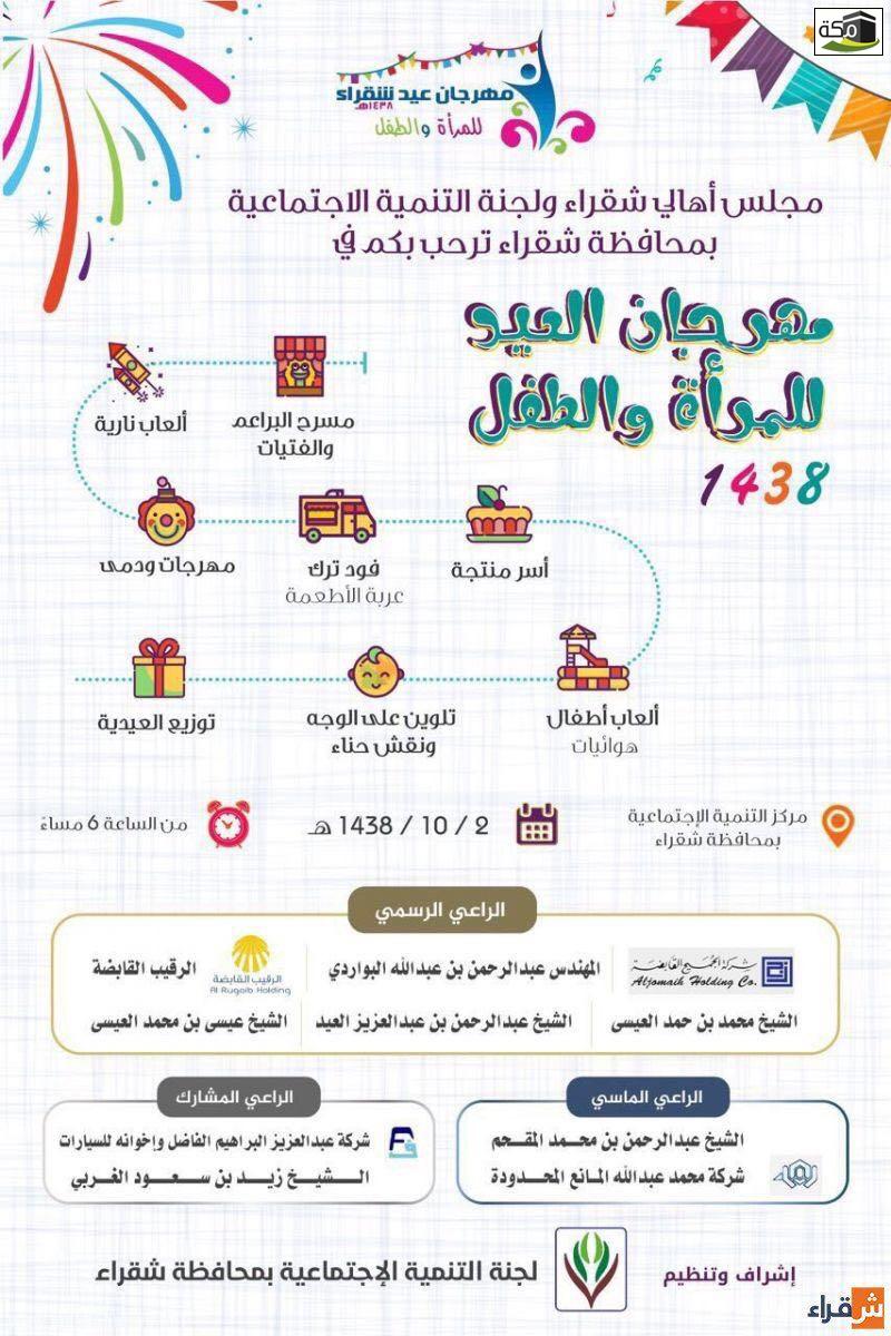 من جهته وجه مجلس أهالي شقراء ولجنة التنمية الاجتماعية الاهلية بمحافظة شقراء الدعوة للعموم للمشاركة في مهرجان عيد شقراء للمرأة والطفل؛ والاستمتاع بفعالياته المتنوعة.
