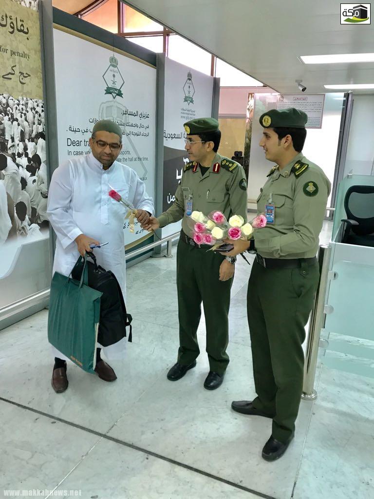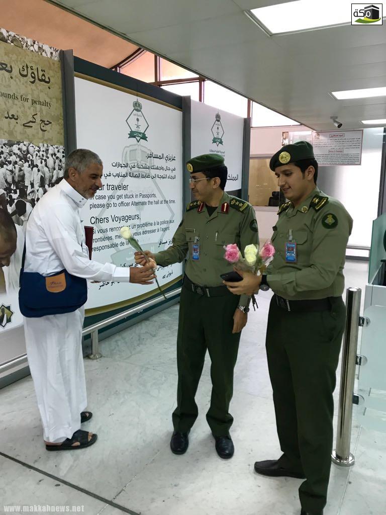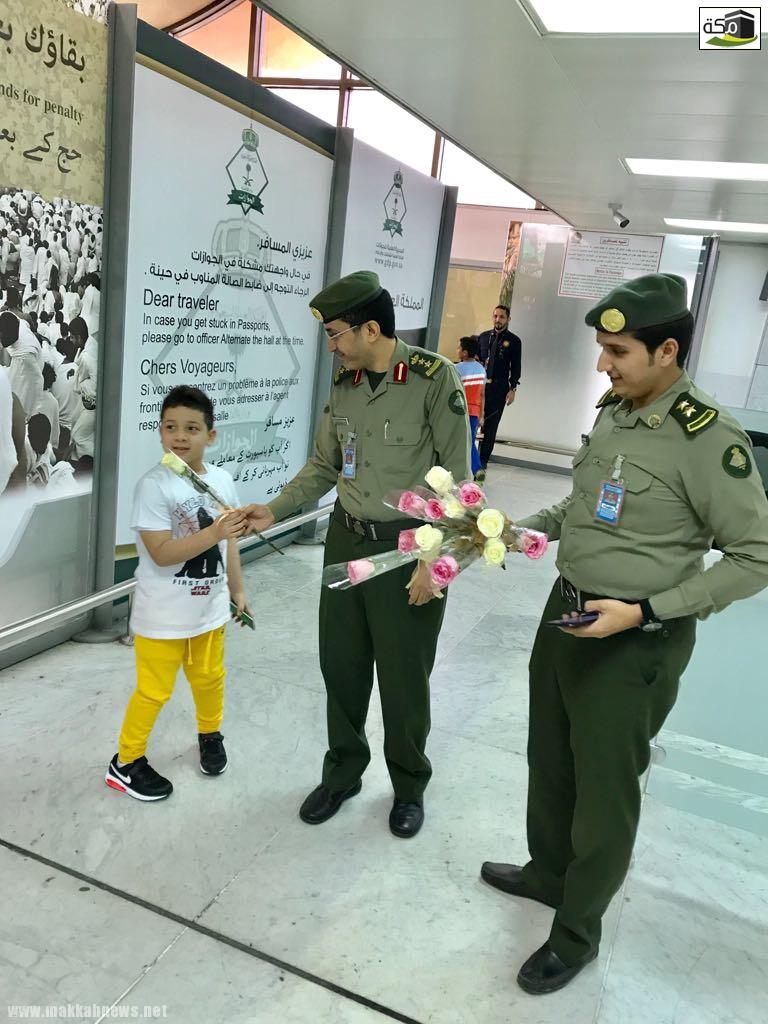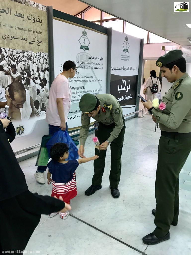 حيث تم توزيع الهدايا والحلوى والشكولاتة وتقديم الضيافه العربيه علي ضيوف بيت الله الحرام مصحوبة بالقهوه العربية والتمر والماء البارد وتوزيع باقات الورود وذلك بمناسبة عيد الفطر المبارك … الجدير بالذكر أن إدارة جوازات مطار الملك عبد العزيز بجدة تبنت استقبال ضيوف بيت الله الحرام وتوديهم بالهدايا والورود لتعكس حرص واهتمام حكومة خادم الحرمين الشريفين بتقديم أفضل الخدمات للحجاج والزوار والمعتمرين الذين يأتون الي بيت الله الحرام طوال العام ..