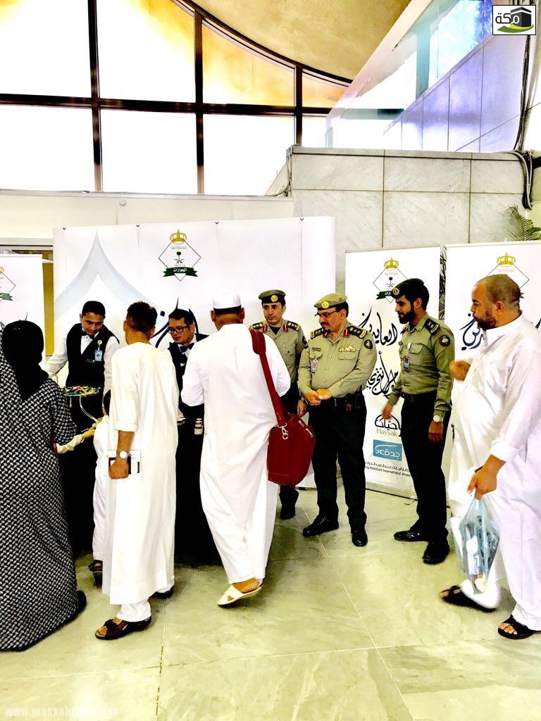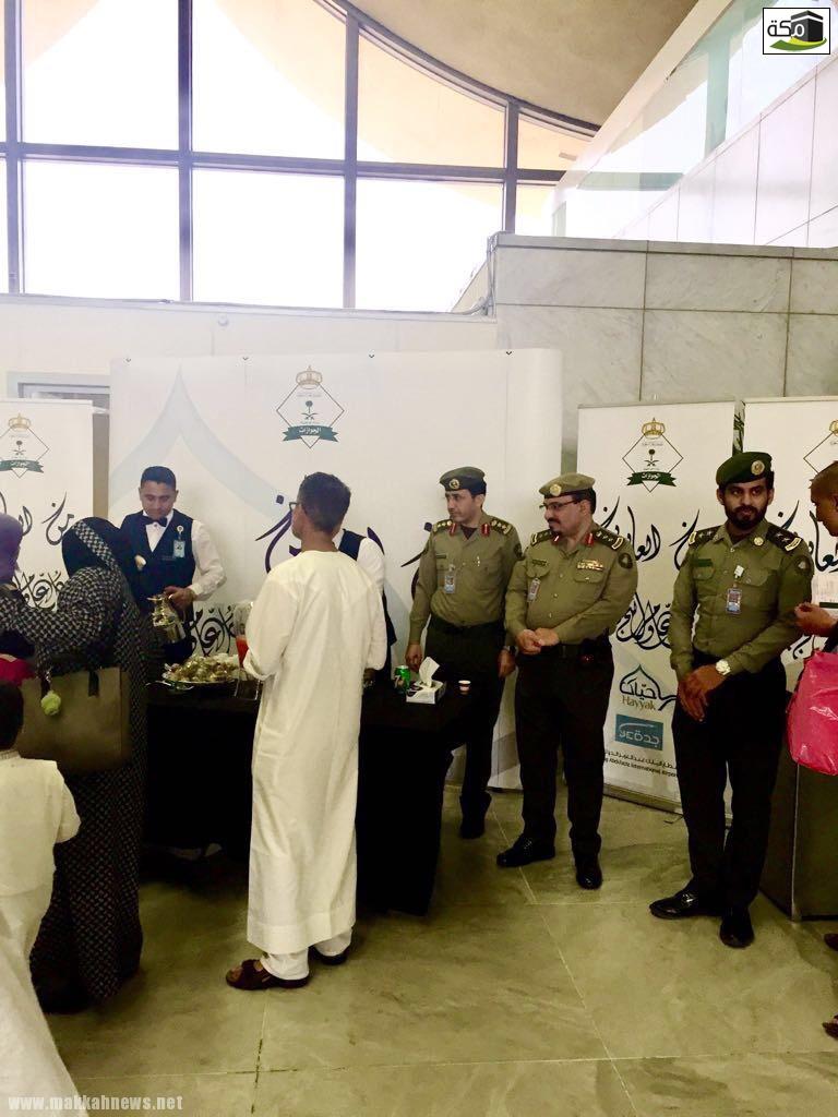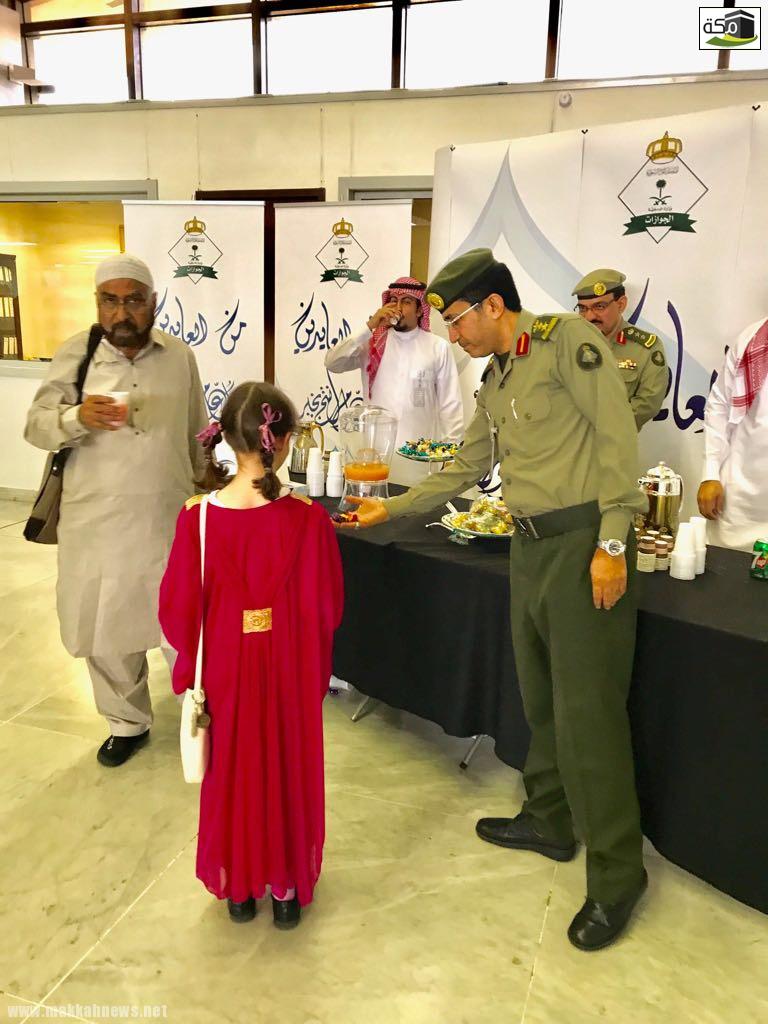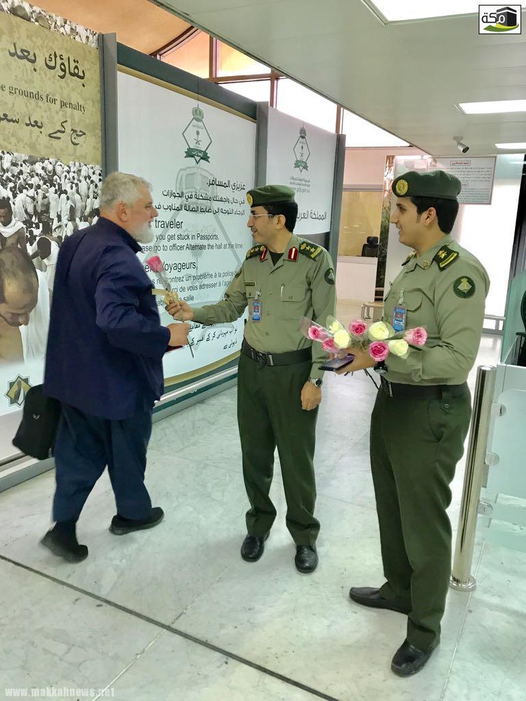 حيث تم توزيع الهدايا والحلوى والشكولاتة وتقديم الضيافه العربيه علي ضيوف بيت الله الحرام مصحوبة بالقهوه العربية والتمر والماء البارد وتوزيع باقات الورود وذلك بمناسبة عيد الفطر المبارك … الجدير بالذكر أن إدارة جوازات مطار الملك عبد العزيز بجدة تبنت استقبال ضيوف بيت الله الحرام وتوديهم بالهدايا والورود لتعكس حرص واهتمام حكومة خادم الحرمين الشريفين بتقديم أفضل الخدمات للحجاج والزوار والمعتمرين الذين يأتون الي بيت الله الحرام طوال العام ..