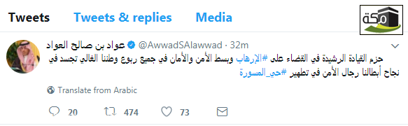 غرّد وزير الإعلام عواد العواد، الأربعاء، في موقع التواصل الاجتماعي “تويتر”، عن النجاحات الأمنية التي حققها رجال الأمن في حي المسورة ببلدة العوامية في محافظة القطيف.