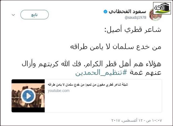 وكتب القحطاني عبر حسابه الشخصي، عبر موقع التدوينات القصيرة “تويتر”، معلقا على القصيدة: “شاعر قطري أصيل، من خدع سلمان لا يأمن طراقة، هؤلاء هم أهل قطر الكرام. فك الله كربتهم وأزال عنهم غمة تنظيم الحمدين”.