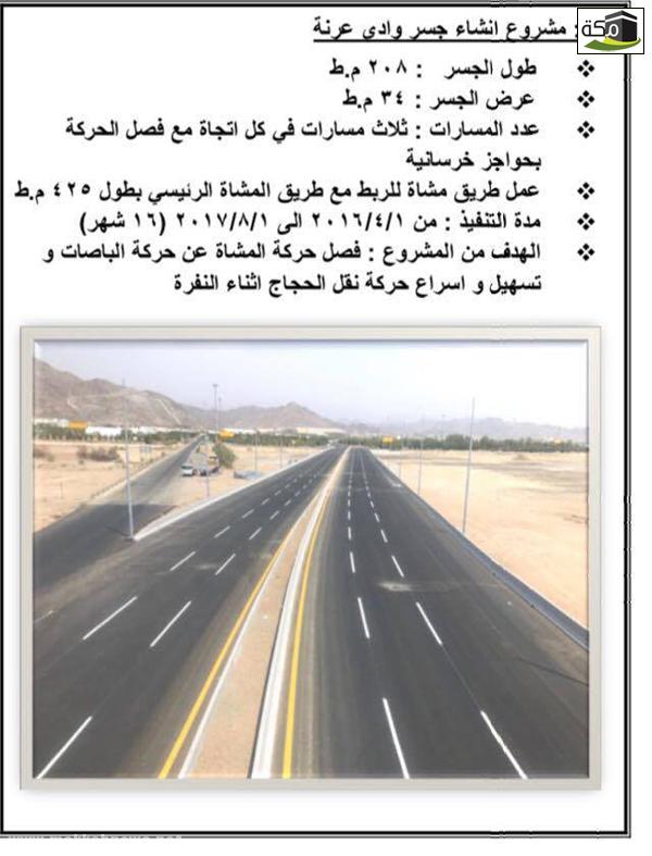 وتفقد نائب أمير مكة ميدانياً خلال الجولة مشروع جسر وادي عرنة المنفذ من قبل وزارة النقل، كما وقف على طريق المشاة الذي يربط عرفة بمنى ، ومن ثم وقف على مستشفى منى الطوارئ الموسمي والذي يعمل خلال فترة الحج منذ اليوم السابع من شهر ذي الحجة من كل عام وحتى مساء يوم الـ 20 من الشهر ذاته، وتبلغ مساحته الإجمالية 34394 متراً مربع بسعة سريرية إجمالية تبلغ 216 سريراً.