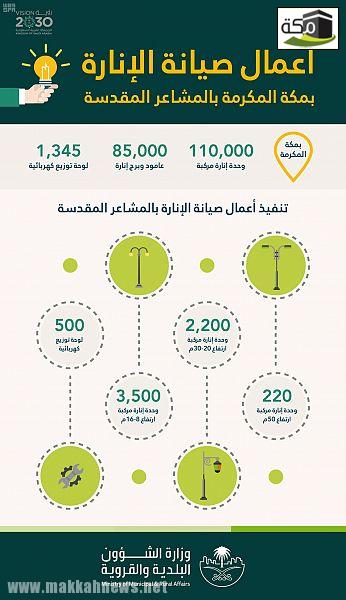 أنهت وزارة الشؤون البلدية والقروية ممثلة في امانة العاصمة المقدسة أعمال الصيانة، وتجهيز 200 ألف وحدة إنارة في مكة المكرمة والمشاعر المقدسة، مركبة على أعمدة الشبكة، البالغ عددها 85 ألف عامود وبرج إنارة, إلى جانب تجهيز 950 لوحة توزيع كهربائية, فيما تبلغ أطوال الكابلات الأرضية 900 ألف متر طولي.