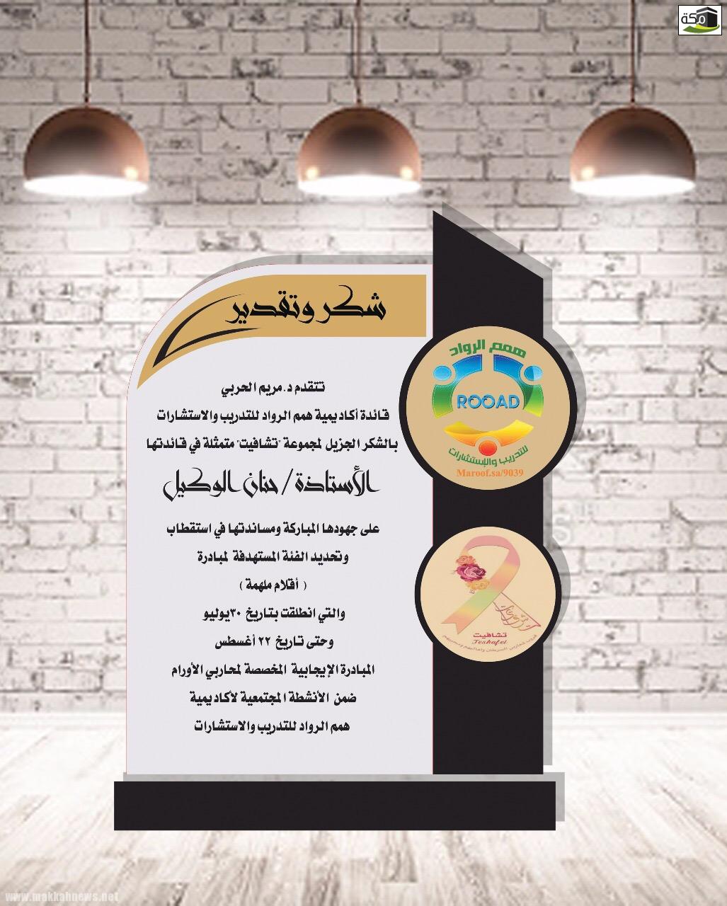 على جهودها المباركة ومساندتها في استقطاب وتحديد الفئة المستهدفة لمبادرة أقلام ملهمة والتي انطلقت بتاريخ 30يوليو 2017