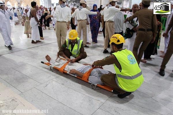 وأضاف العصيمي أن بعض الحالات تتم مساعدتها ونقلها إلى مستشفى أجياد أو مستشفى الطوارئ عبر نقالات وعربات،موضحاً أن الإصابات داخل الحرم وساحاته كثيرة ومتنوعة، ويأتي في مقدمتها السقوط والإغماء والإرهاق نتيجة الإجهاد الحراري، مشيراً إلى أن أفراد القوة تلقوا دورات خاصة، حيث يتم تدريبهم على كيفية نقل الإصابات بما فيها الخطيرة، وهناك فريق تدريب متخصص من المديرية،وتدريب على رأس العمل في المواقع بالحرم.