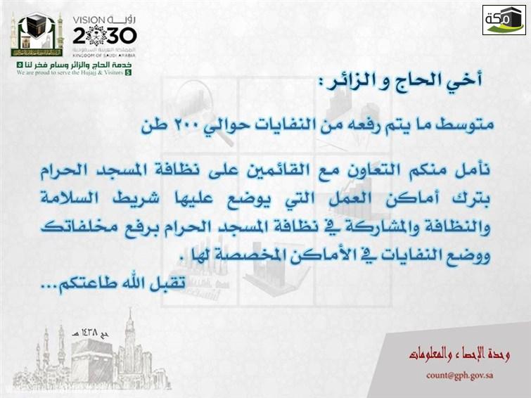 رصدت وحدة الإحصاء والمعلومات جهود إدارة النظافة والفرش بالمسجد الحرام، التابعة للرئاسة العامة لشؤون المسجد الحرام والمسجد النبوي، فيما يخص متوسط حجم النفايات التي ترفع من المسجد الحرام والتي وصلت لـ 200 طن تقريباً .