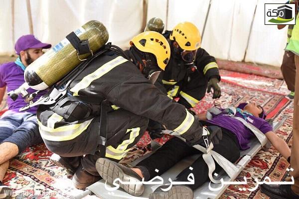 وقامت فرق الدفاع المدني خلال الفرضية، بإنقاذ وإخلاء عدد كبير من المحتجزين، ونقل (15) حالة وفاة افتراضية إلى مناطق الفرز، كما تمكنت من إنقاذ (37) حالة إصابة افتراضية ومن ثم إلى المستشفيات القريبة مع مراعاة الاختصاص واستيعاب المستشفيات، وشاركت قوات الدفاع المدني بالتنسيق مع مرور العاصمة المقدسة من إعادة حركة المرور بمنطقة الحادث إلى حركتها الطبيعية بعد أن تعطلت بسبب حادثة الحريق.