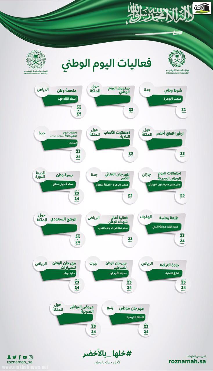 ويذكر أن 17 محافظة ومدينة ستشلمها فعاليات اليوم الوطني، وهي: “الرياض، وجدة، والدمام، والخبر، والجبيل، والمدينة المنورة، وأبها، ونجران، وجازان، وحفر الباطن، وعنيزة، وسكاكا، والهفوف، والدرعية، وحائل، وتبوك، وينبع”.