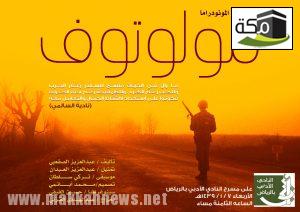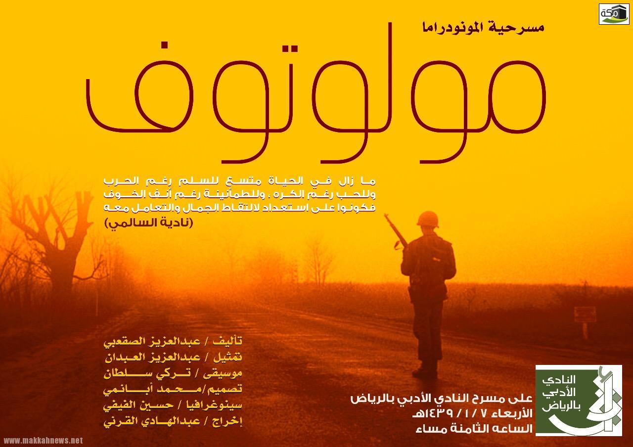 يُقيم النادي الأدبي بالرياض مساء اليوم الأربعاء الموافق ٧ – ١ – ١٤٣٩هـ مسرحية المونودراما بعنوان “مولوتوف” .