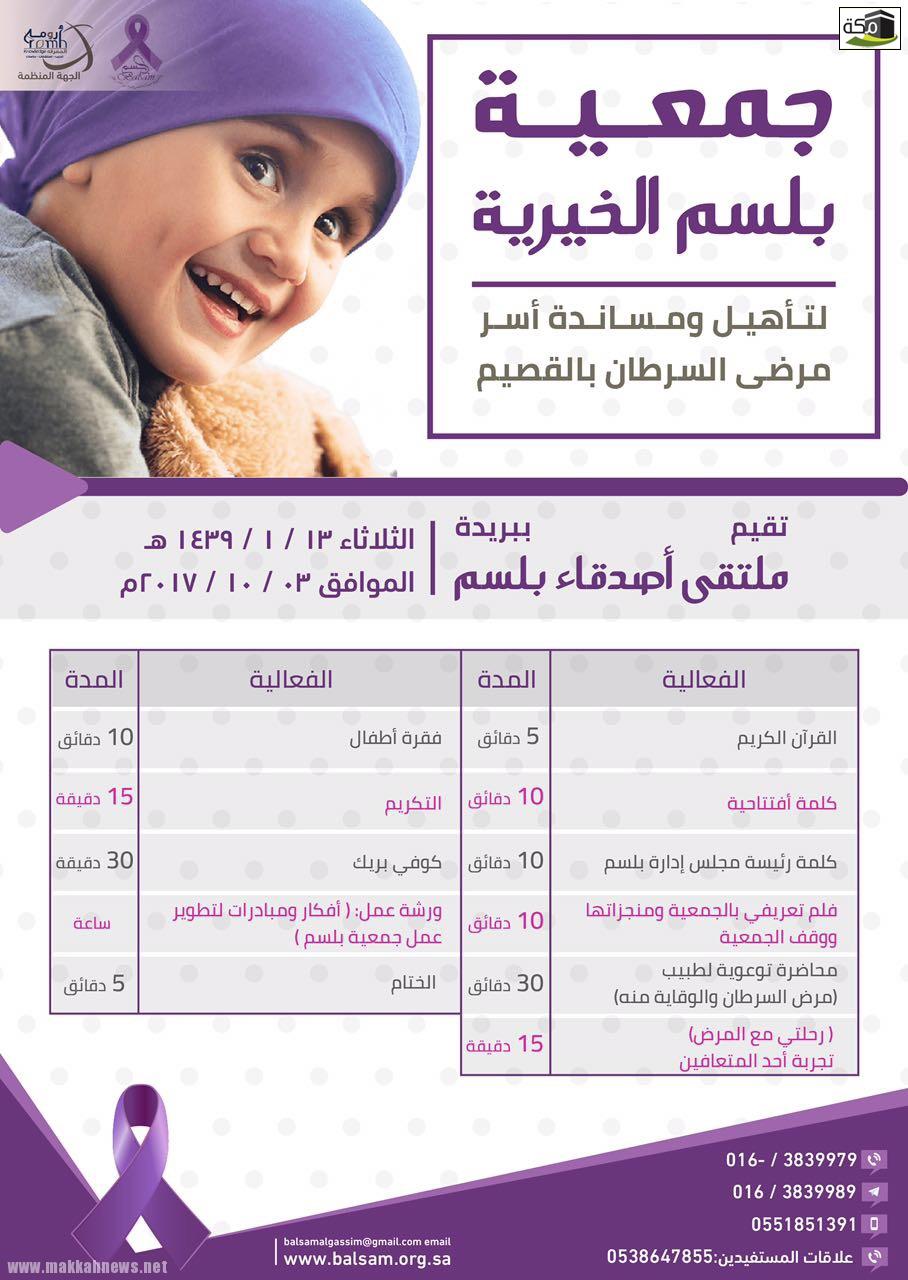 تطلق جمعية(بلسم ) الخيرية لتأهيل ومساندة مرضى السرطان بالقصيم بالتعاون مع ارومة المعرفة للتدريب والاستشارات والدراسات الرائدة في خدمات القطاع الثالث يوم الثلاثاء 13/1/1439هـ الموافق 3/10/2017م ، ملتقى اصدقاء بلسم ، وذلك في مدينة بريدة ضمن الاستراتيجية التي ترسمها امارة المنطقة للنهوض بالعمل الخيري ولمساندة مرضى السرطان والذين يعتبرون جزء من ابناء هذا المجتمع العزيز