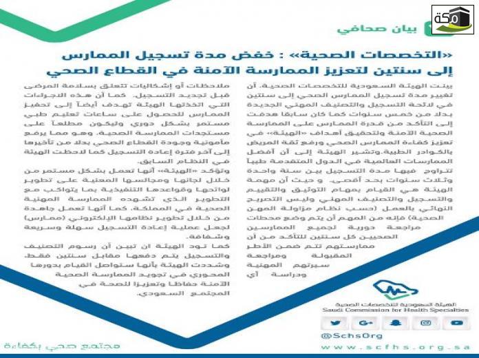 أوضحت الهيئة السعودية للتخصصات الصحية، أن تغيير مدة تسجيل الممارس الصحي إلى سنتين في لائحة التسجيل والتصنيف المهني الجديدة بدلا من خمس سنوات كما كان سابقا, هدفت إلى التأكد من قدرة الممارس على الممارسة الصحية الآمنة ولتحقيق أهداف “الهيئة” في تعزيز كفاءة الممارس الصحي ورفع ثقة المريض بالكوادر الطبية.