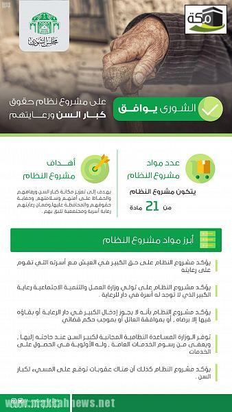 ويهدف مشروع النظام المكون من إحدى وعشرين مادة, إلى تعزيز مكانة كبار السن ورفاههم والحفاظ على أمنهم وسلامتهم, وحماية حقوقهم والمحافظة عليها ,وضمان رعايتهم رعاية أسرية ومجتمعية تليق بهم .