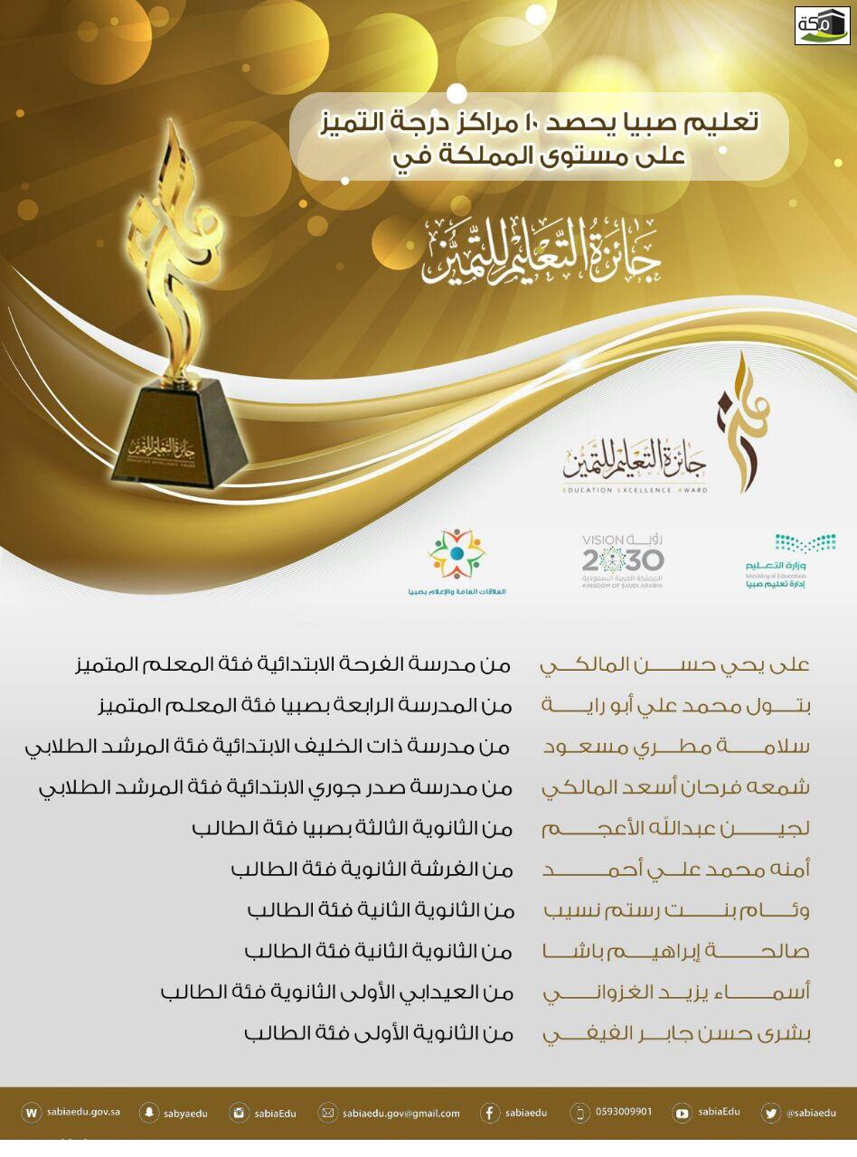 حصدت إدارة تعليم صبيا 16مركزاً متقدماً في جائزة وزارة التعليم للتميز في دورتها الثامنة للعام الدراسي 1437 ـ 1438هـ جاء ذلك بعد أن أعلن موقع الجائزة ظهر اليوم أسماء الفائزين والفائزات, حيث حققت الإدارة إنجازاً جديداً وذلك بعد انتقالها إلى مستوى الإدارة المؤثرة في فئة التميز الإداري، وتحقيق 6 مراكز متقدمة في فئة التميز و10مراكزضمن درجة التميز.
