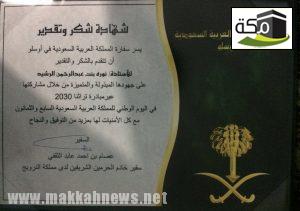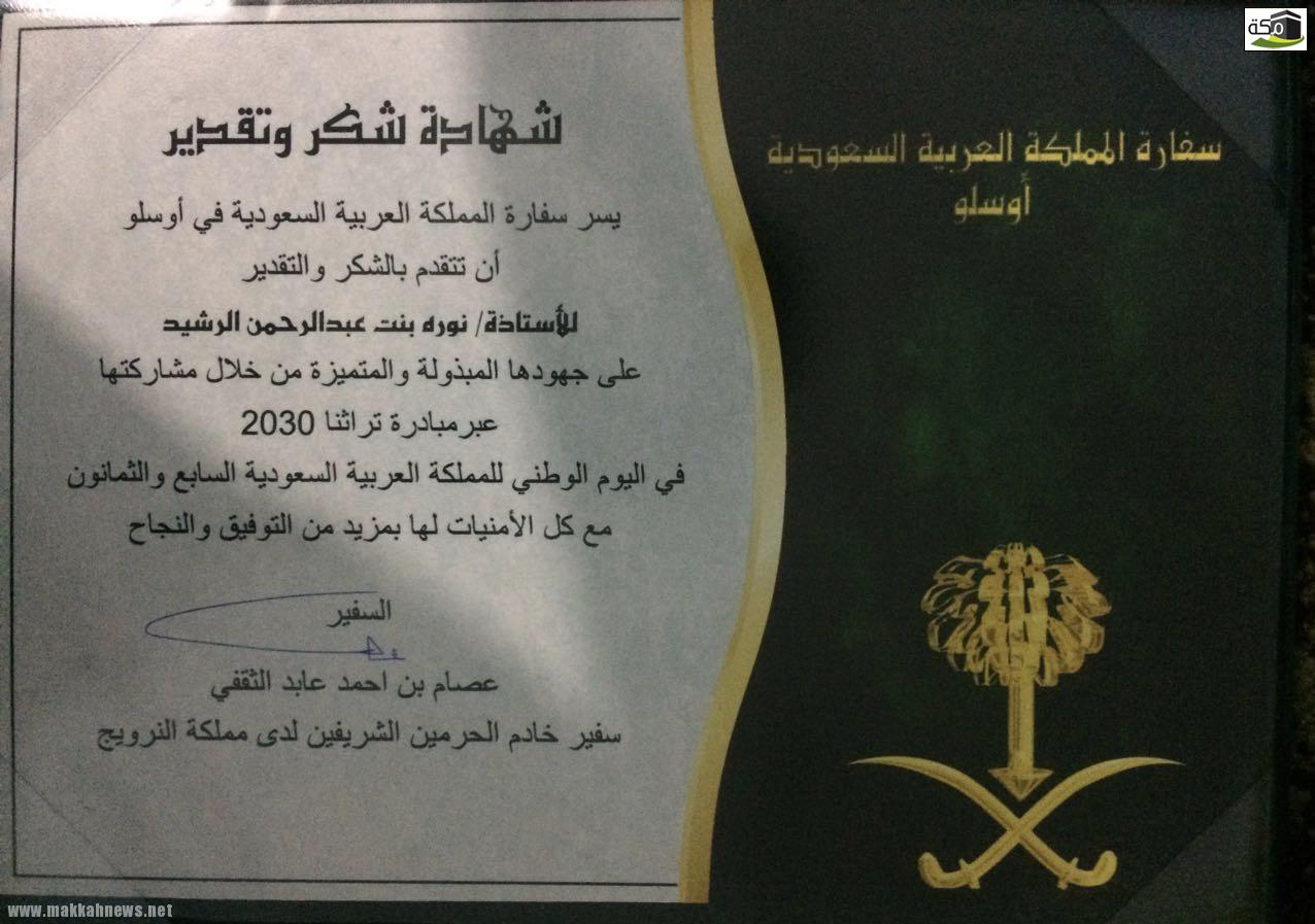 سفير المملكة العربية السعودية لدى مملكة “النرويج” الأستاذ “عصام بن أحمد عابد الثقفي” يُكرّم سعادة الأستاذة “نورة بنت عبدالرحمن الرشيد ” نظير جهودها المبذولة و المتميزة خلال مشاركتها عبر مبادرة ” تراثنا ٢٠٣٠ ” في اليوم الوطني للمملكة العربية السعودية السابع و الثمانون ، داعياً الله لها بمزيداً من التوفيق والنجاح