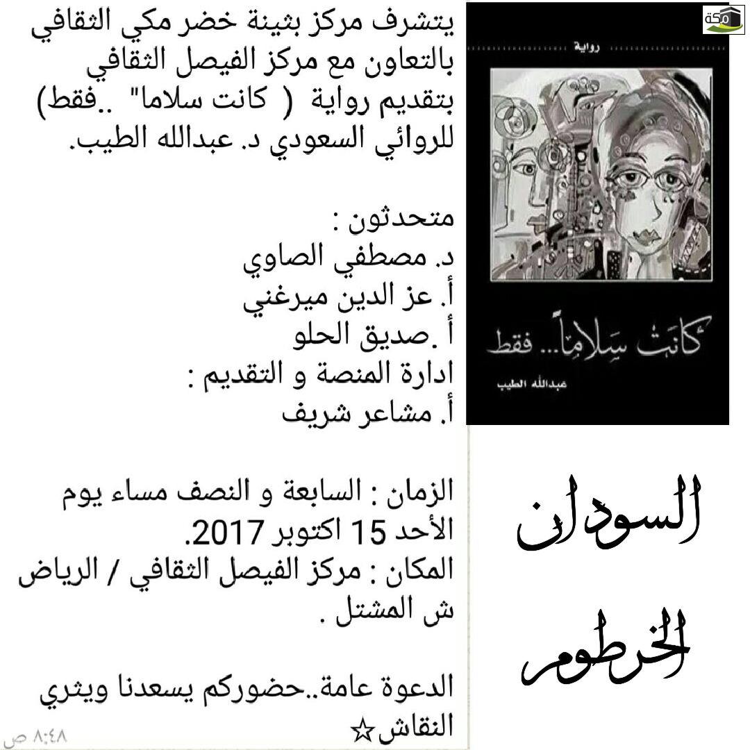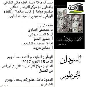 في بادرة تجسد معنى التبادل الثقافي بين الشعوب والدول، احتضن مركز الأديبة بثينة خضر مكي، بالتعاون مع مركز الفيصل الثقافي، تظاهرة ثقافية جميلة، حين أحيا ندوة أدبية، إحتفاء برواية “كانت سلاماً فقط” للروائي والمترجم السعودي د. عبدالله الطيب، يوم الأحد الماضي الموافق للخامس عشر من شهر أكتوبر الحالي في مدينة الخرطوم، عاصمة السودان الشقيق. شارك في الندوة مجموعة من الباحثين والمهتمين بعالم الرواية والأدب. كما شارك النادي السوداني للكتاب ممثلا في مديرة النادي الأستاذة مشاعر شريف، والتي كانت مقدمة الندوة، وتحدث فيها كل من الدكتور مصطفى الصاوي والأستاذ عز الدين ميرغني والأستاذ صديق الحلو.