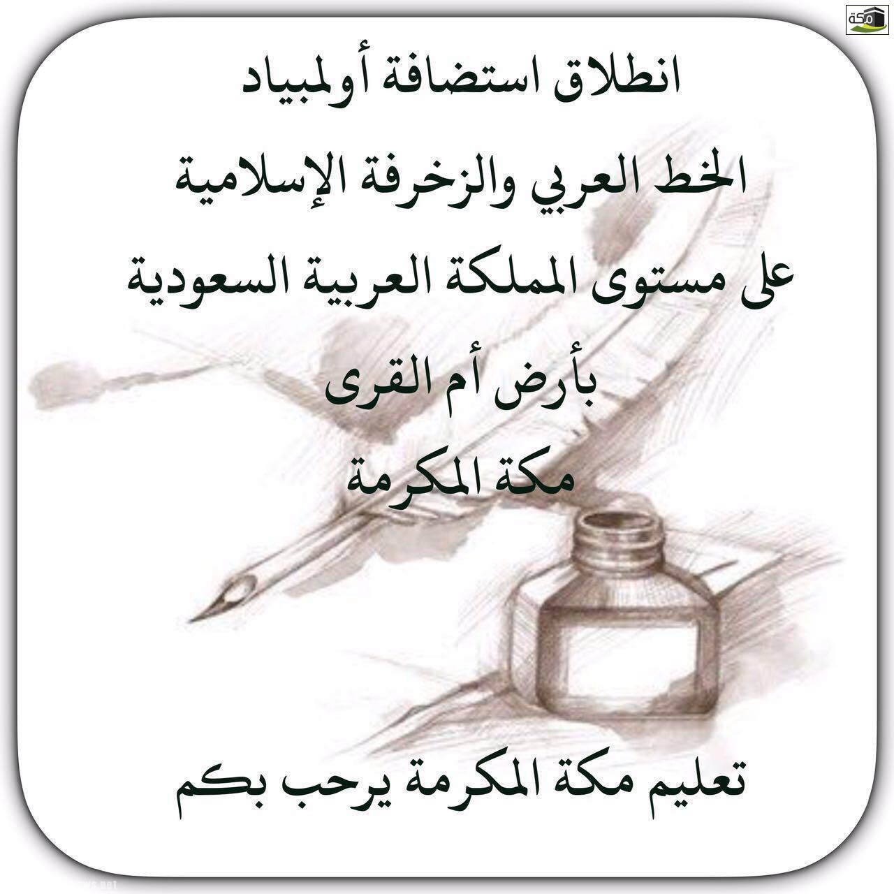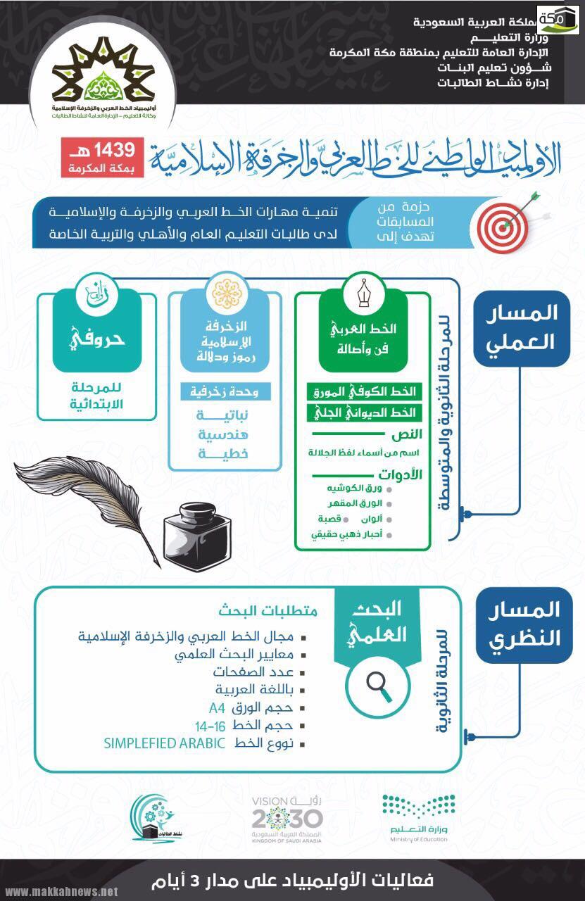 انطلقت بالإدارة العامة للتعليم بمنطقة مكة المكرمة ممثلة بإدارة النشاط الطلابي بوزارة التعليم اليوم الأحد الموافق 2 / 2/ 1439هـ ، فعاليات أولمبياد الخط العربي والزخرفة الإسلامية والذي تستضيفه إدارة نشاط الطالبات بتعليم مكة على مستوى الوطن برعاية من سعادة المدير العام للتعليم بمنطقة مكة المكرمة الأستاذ محمد بن مهدي الحارثي وبإشراف ومتابعة مساعدة المدير للعام للشؤون التعليمية الدكتورة آمنة بنت محمد الغامدي.