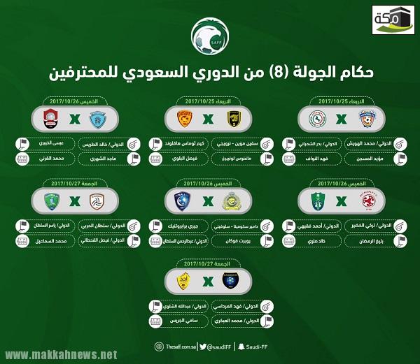 أعلنت لجنة الحكام بالاتحاد السعودي لكرة القدم ، أسماء حكام الجولة الثامنة للدوري السعودي للمحترفين لكرة القدم التي ستقام أيام الأربعاء والخميس والجمعة القادمة .