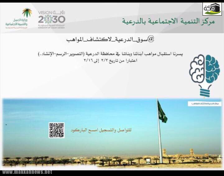 أطلق مركز التنمية الاجتماعية بالدرعية التابع لفرع وزارة العمل والتنمية الاجتماعية بمنطقة الرياض مساء أمس الاثنين برنامجه الاجتماعي سوق الدرعية، الذي يهدف لاكتشاف مواهب الشباب في مجالات التصوير الفوتوغرافي والرسم والإنشاد والاختراع، حيث يشترط للمشاركة فيه أن يكون المتقدم من سكان محافظة الدرعية، وأن يعرض موهبته بشكل جذاب وفق معايير محددة في إطار القيم الاجتماعية والأخلاقية المتعارف عليها في المجتمع السعودي. ويتم استقبال الطلبات الكترونياً لـِ 40 شاب على الرابط https://goo.gl/forms/vgp6QYiDFaDQdtx73 ومن ثم التواصل مع المتقدمين من قبل أعضاء اللجنة المكونة من عدة مشرفين من منسوبي المركز، لتحديد موعد تقديم الموهبة أمامهم، واختيار الفائز ثم تكريمه بشهادة تقديرية من المركز وإنتاج فيلم خاص به، يتم عرضه في كافة مواقع التواصل الاجتماعي.