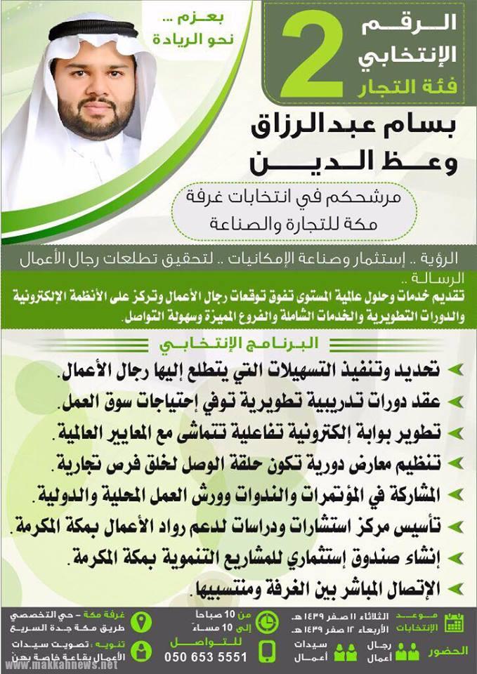 البرنامج الإنتخابي لمرشح عضوية غرفة مكة بسام وعظ الدين