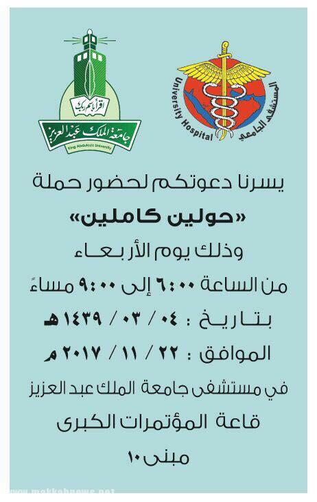 وسينعقد مؤتمر الرضاعة الطبيعية الخاص بفعاليات (حولين كاملين) في مستشفى جامعة الملك عبدالعزيز بالقاعات الرئيسية يوم الأربعاء 4/3/1439 الموافق 22/11/2017م ابتداءاً من الساعه 6 مساء وحتى 9 مساء ونرحب بالجميع