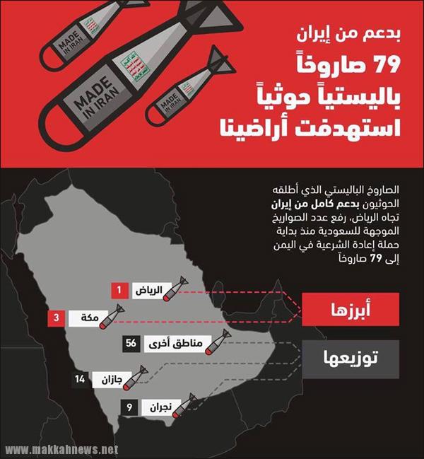 فمنذ انطلاقة عملية إعادة الشرعية في اليمن، لم تتوقف الميليشيات الحوثيةش العميلة لإيران عن استهداف سلامة المواطنين والمقيمين في المملكة، حيث أطلقت منها 14 تجاه جازان، و9 باتجاه نجران، أما الـ56 الأخرى فكانت موجهة لمناطق متفرقة وسط وجنوب وغرب البلاد.
