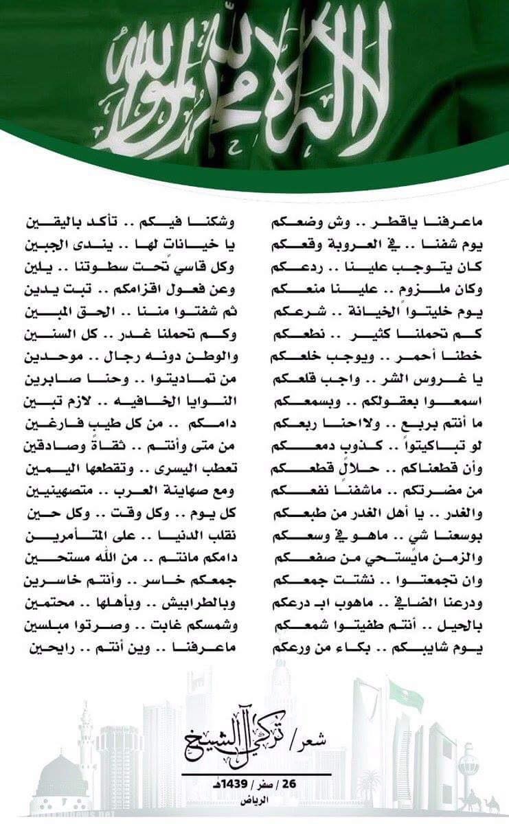 وغرد تركي آل الشيخ عبر حسابه على تويتر، اليوم، قائلا: ” ما عرفنا يا قطر .. وش وضعكم، وشكنا فيكم .. تأكد باليقين، يوم شفنا .. في العروبة وقعكم، يا خياناتٍ لها .. يندى الجبين”، مرفقًا معها صورة للقصيدة كاملة.