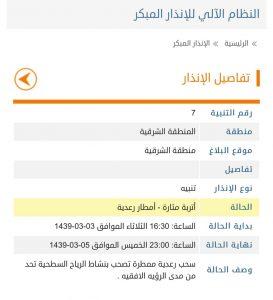 إلى ذلك وصف موقع الهيئة العامة للأرصاد وحماية البيئة حالة الطقس بالمنطقة الشرقية حمل تنبيهاً بالرقم 7 على المنطقة الشرقية والرقم 5 على حفرالباطن وكان موقع البلاغ حفرالباطن والقيصومة والاجزاء المجاورة لها بالإضافة الى المنطقة الشرقية الجبيل والاجزاء المجاوره لها، وكان موقع الارصاد قد وصف حالة الطقس بأن حالته أتربة مثارة وأمطار رعدية