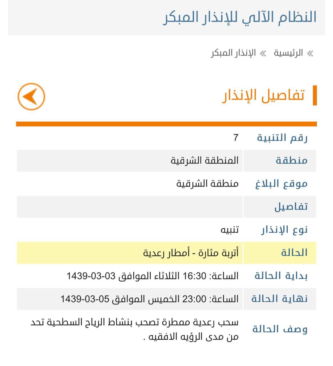 نهاية الحالة الساعة: 09:00 الأربعاء الموافق 04-03-1439 ونشاط في الرياح السطحية مما يؤدي إلى إثارة الأتربة والغبار . ويتوقع هطول امطار رعديه من مساء هذا اليوم  يلي ذلك انخفاض في درجات الحراره من مساء يوم الاربعاء .