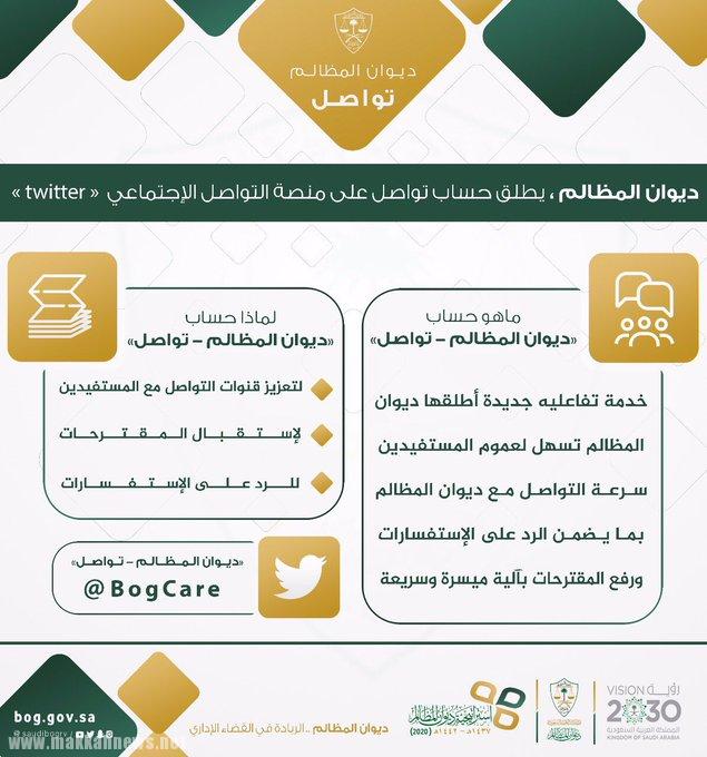 أطلق ديوان المظالم اليوم, خدمة تفاعلية جديدة عبر تخصيص حساب ( تواصل ـ ديوان المظالم ) BogCare@ على منصة تويتر للتواصل الفعّال مع المستفيدين .
