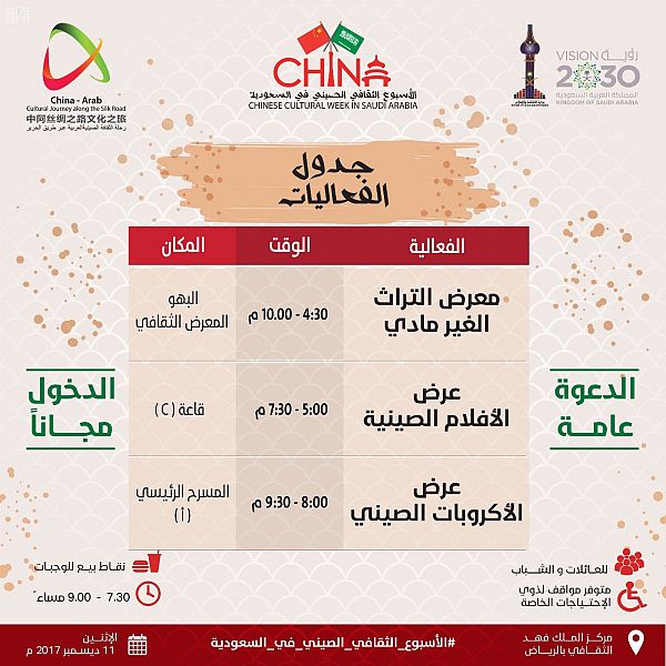برعاية معالي وزير الثقافة والإعلام الدكتور عواد بن صالح العواد تبدأ مساء غد فعاليات الأسبوع الثقافي الصيني السعودي الذي تنظمه الوزارة بمركز الملك فهد الثقافي في الرياض .
