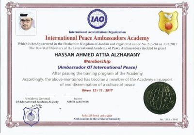 تم منح مدير تحرير صحيفة مكة الالكترونية عضو الهيئة الاستشارية الاعلامية بالمركز الإعلامي بالباحة مدير المركز الإعلامي بمحافظة الحجرة الزميل حسن الصغير لقب سفير السلام الدولي من الاكاديمية الدولية لسفراء السلام والمعتمدة دولياً من هيئة الأمم المتحده ومنظمة الاعتماد الدولية ( IAO ) لنشر السلام في العالم .