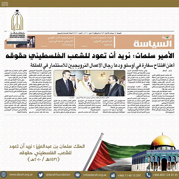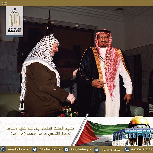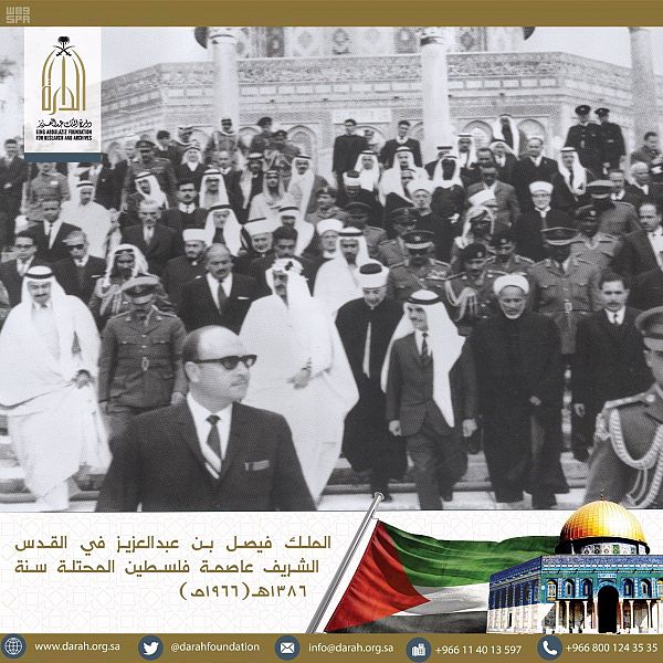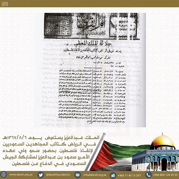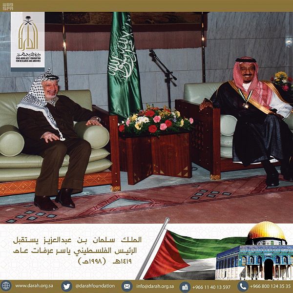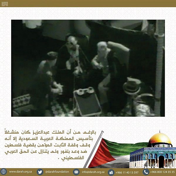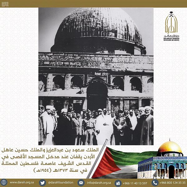 بدأت دارة الملك عبد العزيز اليوم, بإطلاق مجموعة صور تاريخية عن موقف المملكة من قضية فلسطين على حسابها الرسمي في تويتر@darahfoundation، التي تعكس الجوانب التاريخية المختلفة ومواقف ملوك المملكة العربية السعودية خلال العقود الماضية من عهد المؤسس الملك عبد العزيز ـ رحمه الله ـ, إلى عهد خادم الحرمين الشريفين الملك سلمان بن عبد العزيز آل سعود ـ حفظه الله ـ .