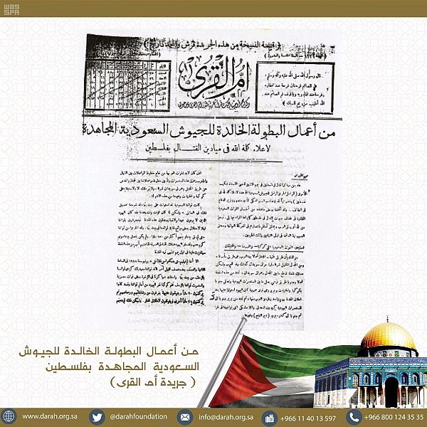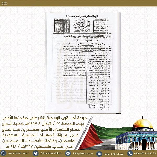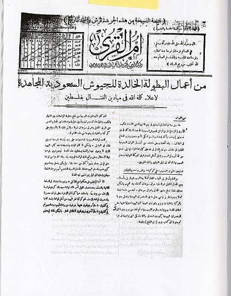 وصورة في أم القرى يوم الجمعة 22 شوال 1367 هـ خطبة لوزير الدفاع السعودي الأمير منصور بن عبد العزيز في فرقة الجهاد النظامية السعودية بفلسطين، وقائمة الشهداء السعوديين في حرب فلسطين 1367هـ / 1948م، وكذلك صورة لرسالة من القيادة العامة لقوات فلسطين تعزي في 9 شهداء سعوديين في وقعة المزرعة يوم 16 / 2 / 1948م.