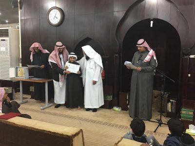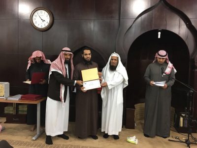 بحضور مدير الجمعية الخيرية لتحفيظ القرآن الكريم بالدوادمي الأستاذ منصور بن محمد العيد ونائبة سليمان السلامة والمشرف على أوقاف محمد الراجحي ،الأستاذ سعد الطخيس ،أقامت الجمعية الخيرية لتحفيظ القرآن الكريم بالتعاون مع اوقاف محمد بن عبدالعزيز الراجحي رحمه الله، حفل تكريم للمشاركين في (برنامج يوم مع القرآن الاول) وذلك يوم الثلاثاء الموافق ١٤٣٩/٠٤/٠١هـ بجامع الراجحي