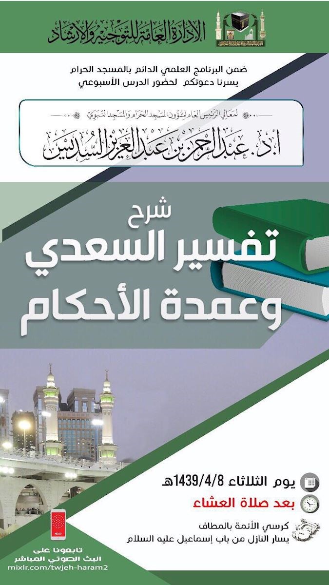 يلقي معالي الرئيس العام لشؤون المسجد الحرام والمسجد النبوي الشيخ الدكتور عبدالرحمن بن عبدالعزيز السديس درسه الأسبوعي في شرح تفسير السعدي وعمدة الأحكام اليوم الثلاثاء الموافق 8/4/1439هـ.