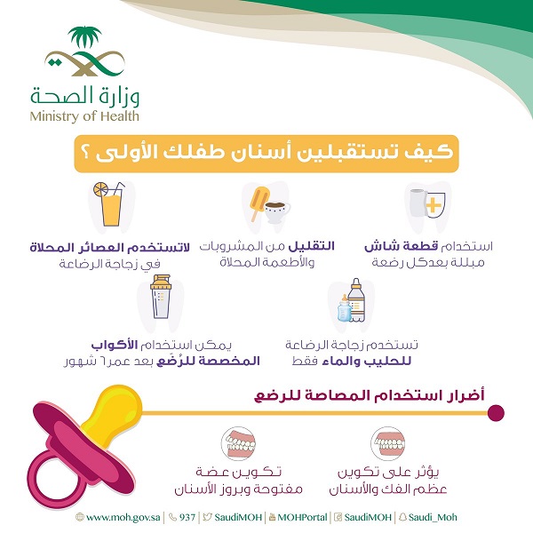 وبينت “الصحة” كيفية حماية أسنان الطفل من التسوس وذلك من خلال استخدام قطعة قماش مبللة بعد كل رضعة، وتنظيف أسنان الطفل مع أول سن عند عمر ستة أشهر مرتين يومياً، مؤكدة أن تنظيف أسنان الطفل يعد سلوك وتربية.