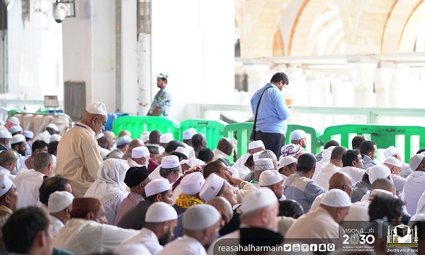 وفي الخطبة الثانية أوصى فضيلته: بالاجتماع على كلمة محكمات الشريعة والدعوة إليه وتربية الصغار قبل الكبار عليها وحث الناس على التفقه والاعتصام بها هو واجب العصر اليوم على كل العلماء والدعاة والمعلمين والمربين ومن تسنم منا منابر التوجيه في كل الوسائل, فالأمة اليوم تتعرض لهجوم وعدوان غير مسبوق على عقيدتها وفكرها وثقافتها وهويتها وهذه المحكمات والثوابت إذا رسخت في القلوب والعقول ونشأت عليها الناشئة فإنها من أعظم الأسباب التي تحفظ الأمة من ضياع الهوية وفقدان التوجيه الصحيح.