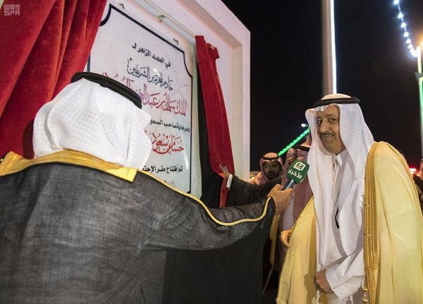 ولدى وصول سموه مقر الحفل قام بافتتاح مقر الساحة الشعبية الجديد ، حيث إزاح الستار عن اللوحة التذكارية للمشروع ، ثم اطلع على عدد من اللوحات التي توضح مكوناته ، مستمعاً إلى شرح من أمين منطقة الباحة الدكتور علي بن محمد السواط عن مشروع الساحة الذي بلغت تكلفته أكثر من 5.829.000 ريال ، ويقع على مساحة إجمالية تقدر بنحو 16.650 متر مربع ، وتتكون من مبنى ومنصة كبار الزوار ، ومدرج يتسع لأكثر من 1500 شخصاً ، وأماكن مخصصة للعائلات وساحة عرض الاحتفالات وصالة الطعام واستراحات ومرافق عامة.