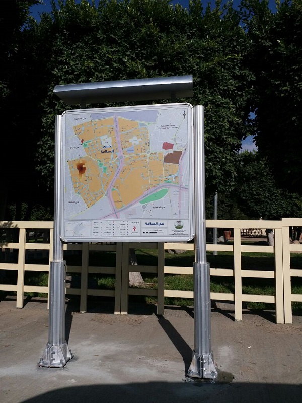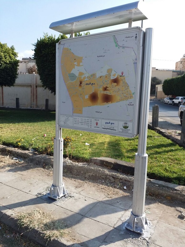 وتحمل اللوحات الإرشادية مسمى ” أنت هنا “، وتتضمن خريطة الحي، كما تحتوي على أماكن مواقف السيارات، والخدمات الحكومية، والخدمات التجارية، والخدمات الصحية، والخدمات التعليمية، والفنادق والشقق المفروشة، والخدمات الترفيهية، والخدمات الدينية، وخدمات الغذاء، وموقع الحي في خريطة المدينة ، وتم توزيع اللوحات على أحياء ” السلامة, العزيزية, الفيصلية, العقيق, شهار, قروى, معشي, السداد, الجفيجف, حوايا الشمالية ” ضمن مشروع التسمية والترقيم بالمحافظة.