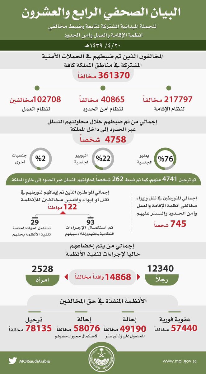أسفرت الحملات الميدانية المشتركة التي انطلقت يوم الأربعاء الموافق 26 / 2 / 1439 هـ وحتى نهاية يوم السبت 19 / 4 / 1439هـ لتعقب وضبط مخالفي أنظمة الإقامة والعمل وأمن الحدود والتي تمت في مناطق المملكة كافة عن النتائج التالية: –