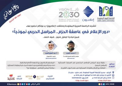 تنظم الجامعة العربية المفتوحة وملتقى “إعلاميون” مساء غداً الاثنين لقاء “دور الإعلام في عاصفة الحزم.. المراسل الحربي نموذجاً” ضمن مبادرة “وطن منيع” على مسرح الجامعة في حي حطين في الرياض.
