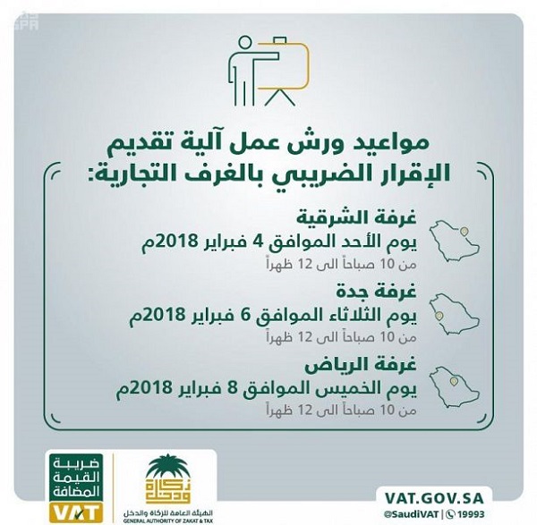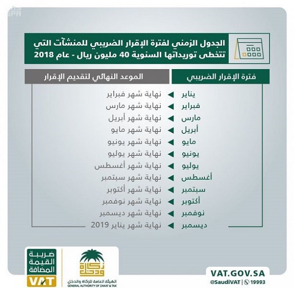 دعت الهيئة العامة للزكاة والدخل جميع المنشآت المسجلة في ضريبة القيمة المضافة التي تتخطى قيمة توريداتها السنوية من السلع والخدمات الخاضعة للضريبة مبلغ 40 مليون ريال سعودي، بضرورة تقديم إقراراتها الضريبية بشكل شهري، وذلك وفق نظام ضريبة القيمة المضافة ولائحته التنفيذية.