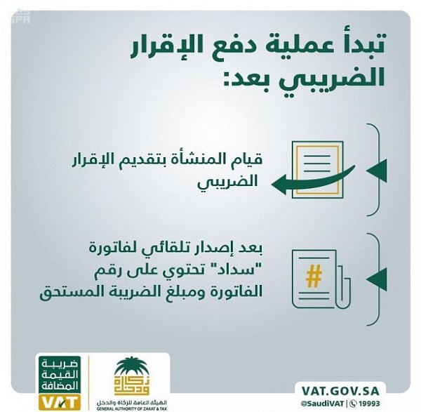وأوضحت الهيئة أنه بعد قيام المنشأة بتقديم الإقرار الضريبي، سيتم وبشكل تلقائي إصدار فاتورة “سداد” تحتوي على رقم الفاتورة ومبلغ الضريبة المستحق, وفور إصدار الفاتورة إلى المنشأة، يتوجب دفع مبلغ الضريبة المستحق، من خلال بوابة الدفع الإلكترونية “سداد” عبر الإنترنت أو من خلال الصراف الآلي , وبعد إتمام عملية الدفع، ستستلم المنشأة إشعارا من الهيئة العامة للزكاة والدخل بالمبلغ الذي تم سداده.