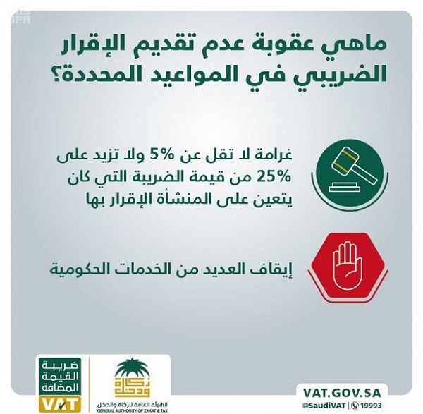 وأكدت الهيئة العامة للزكاة والدخل أن غرامة عدم تقديم الإقرار الضريبي خلال المدة المحددة، لا تقل عن 5% ولا تزيد عن 25% من قيمة الضريبة التي كان يتعين على المنشأة الإقرار بها، بالإضافة إلى غرامة التأخر في سداد الضريبة المستحقة والتي تعادل 5 % من قيمة الضريبة غير المسددة عن كل شهر أو جزء منه لم تسدد عنه الضريبة، وستتعرض أيضاً المنشآت غير الملتزمة بتقديم إقراراتها إلى إيقاف العديد من الخدمات الحكومية.